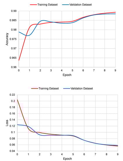 The graphs of accuracy and loss in the function of the number of epochs are shown in Figure 5. As it can be seen, Deep Splicer has almost no over-fitting.