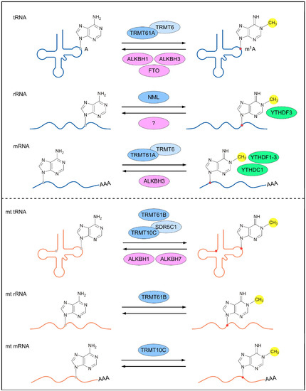 Reversible m1A methylomes in nuclear- and mitochondrial-encoded transcripts are achieved via the dynamic regulation of m1A RNA-modifying proteins (m1A methyltransferases, m1A demethylases and m1A-dependent RNA-binding proteins). The characterization of m1A-modifying proteins is crucial for understanding the mechanisms underlying m1A-mediated gene regulation and the biological roles of m1A RNA modification. To date, several m1A RNA-modifying proteins responsible for nuclear- and mitochondrial-encoded transcripts have been identified in humans (Figure 1).