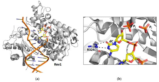 - Nair, D.T.; Johnson, R.E.; Prakash, L.; Prakash, S.; Aggarwal, A.K. DNA synthesis across an abasic lesion by yeast REV1 DNA polymerase. J. Mol. Biol. 2011, 406, 18–28. [Google Scholar] [CrossRef] [PubMed]