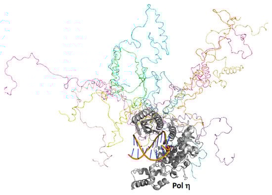 - Powers, K.T.; Elcock, A.H.; Washington, M.T. The C-terminal region of translesion synthesis DNA polymerase η is partially unstructured and has high conformational flexibility. Nucleic Acids Res. 2018, 46, 2107–2120. [Google Scholar] [CrossRef]