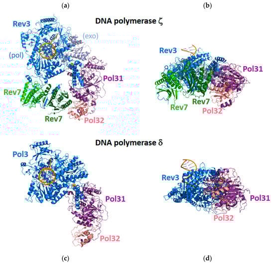 - Johnson, R.E.; Prakash, L.; Prakash, S. Pol31 and Pol32 subunits of yeast DNA polymerase delta are also essential subunits of DNA polymerase zeta. Proc. Natl. Acad. Sci. USA 2012, 109, 12455–12460. [Google Scholar] [CrossRef]
