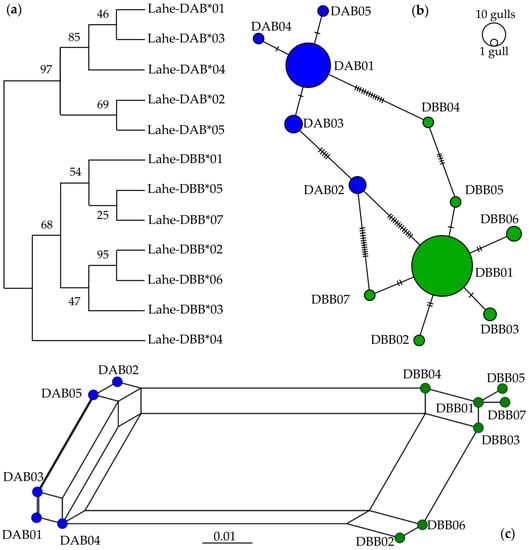 3.2. Inferred Duplication by Phylogenetic Relationships within Heermann’s Gull MHCIIB