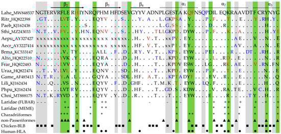 - Anmarkrud, J.A.; Johnsen, A.; Bachmann, L.; Lifjeld, J.T. Ancestral polymorphism in exon 2 of bluethroat (Luscinia svecica) MHC class II B genes. J. Evol. Biol. 2010, 23, 1206–1217. [Google Scholar] [CrossRef] [PubMed]