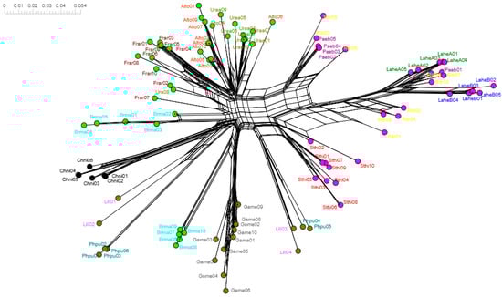 - Bryant, D.; Moulton, V. Neighbor-Net: An Agglomerative Method for the Construction of Phylogenetic Networks. Mol. Biol. Evol. 2004, 21, 255–265. [Google Scholar] [CrossRef]