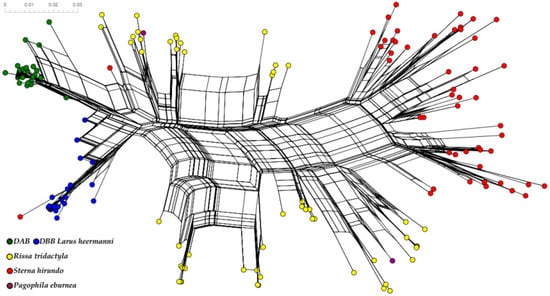 - Leigh, J.W.; Bryant, D. POPART: Full-feature software for haplotype network construction. Methods Ecol. Evol. 2015, 6, 1110–1116. [Google Scholar] [CrossRef]