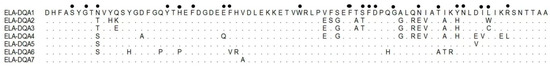 Amino acid sequences of MHC DQA alleles detected in the Przewalski’s horses. The amino acid residues were given in the international single letter code. A dot indicated that the amino acid was the same as in the consensus sequence. A solid point denoted an antigen binding site.