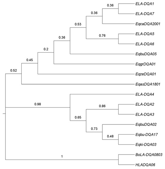The neighbor-joining tree was constructed using our identified DQA allele sequences of Przewalskl’s horses, by combing nine other equine sequences published in the literature. It could be observed from the phylogenetics tree that ELA-DQA2 and ELA-DQA3 in Przewalski’s horses clustered together, but separated from ELA-DQA5 and ELA-DQA6. ELA-DQA1 and ELA-DQA7 belonged to another branch (Figure 2). The phylogenetic relationship between zebras and domestic horses was not as close as that between Przewalski’s horses and domestic horses. Domestic horses were closer to the tree roots than other equine animals.