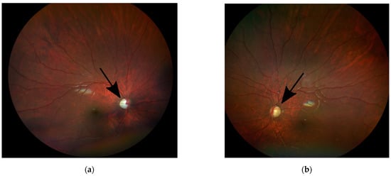 Fundus photos of the right (a) and left (b) eyes of the mother showing mild temporal optic disc pallor in both eyes (black arrows).