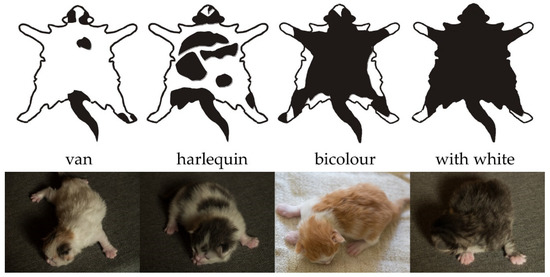 Felinology organizations divide the amount of white spotting in cats into a few patterns; usually these are van, harlequin, bicolor and unspecified amount of white (Figure 1) [13,14,15]. This division assumes that van (EMS code 01) has white on approximately more than 75% of body, harlequin (02) between 50–75%, bicolor (03) 25–50% and cats with an unspecified amount of white (09) less than 25%. Other amounts like mitted (04) and Snowshoe (05) pattern are recognized in Birman, Ragdolls and Snowshoe breeds [13,14,15]. A separate recessive allele (G), situated also in the KIT gene, has been identified for Birman white gloving [16].