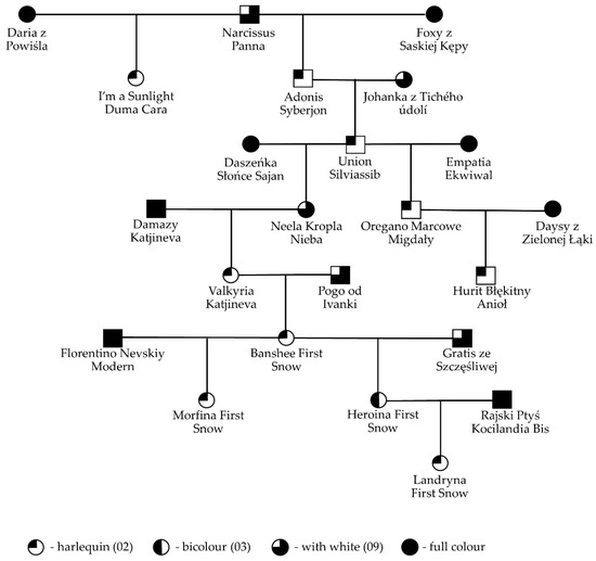 Siberian Cat breed was selected for the analysis as they are characterized by the highest genetic diversity among the breeds [21] and big variation in the amount of white spotting. In this breed, any amount of white is present and accepted by felinological organizations [13,14,15]. The amount of white spotting has a gradually changed character. The official categorization used by felinology organizations was used in our analysis (van, harlequin, bicolor, with white and without white) as this is the only available data. All pedigree data regarding Siberian cats were obtained from PawPeds [22] and Felis Polonia [23] databases. PawPeds is an international organization that provides pedigree databases for many breeds. The Siberian cat database contains pedigrees of cats from all over the world. It is focused mainly on breeding cats and contains only a few data records on whole litters. Felis Polonia is a Polish organization affiliated to the Fédération Internationale Féline d’Europe. It contains data from the largest number of catteries in Poland and has the most complete pedigrees of Siberian cats. It is worth mentioning that whole litters are included in this database.