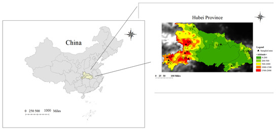 Hubei Province is located in Central China, in the middle reaches of the Yangtze River, with a rich terrain and belongs to the temperate monsoon climate. The geographical environment of the area is hilly and mountainous, with elevations ranging from 200 m to 3100 m, and there are more than 150 kinds of nectar source plants, creating excellent regional natural conditions for Apis cerana cerana [26,27]. Therefore, surveying the population structure and genetic diversity of Apis cerana cerana in this area is deeply needed to understand its adaptation to variable environments and provide more references for protecting honeybee biodiversity in Central China.