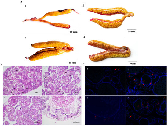 The ovaries of Nile tilapia in the control group at 12 d were full, and the eggs were dark yellow, clearly defined, and countable (Figure 1A(3)). The ovaries were larger at 12 d than at 6 d. Most oocytes in the ovary were at stage V, and the eggs were about to mature and be released (Figure 1B(3)). At 12 d in the heat-stressed group, the ovaries were white and many white eggs were visible to the naked eye (Figure 1A(4)). There were more atretic follicles in the ovaries of heat-stressed fish than in those of the control fish at 12 d (p = 0.03 < 0.05; Table 1). The ovaries were dominated by atretic follicles, the yolk material was completely decomposed, and many stage II and III oocytes were atretic (Figure 1B(4)). The degenerated follicles had only one cavity, which was gradually surrounded by surrounding connective tissue, and orange-brown pigment cells were present in some areas (Figure 1A(4)).