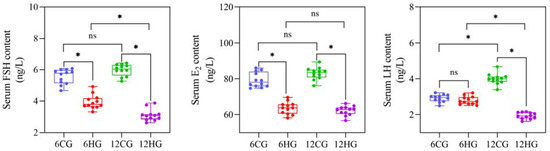 The serum FSH and E2 contents of Nile tilapia at 6 d were significantly lower in the heat-stressed group than in the control group (p = 0.03 < 0.05; Figure 2), and although the serum LH content was slightly lower than that of the control group, the difference was not significant (p = 0.07 > 0.05). At 12 d, the serum LH, FSH, and E2 contents were significantly higher in the control group than in the heat-stressed group (p = 0.03, 0.03, 0.02 < 0.05).