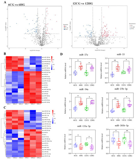 Analysis of differentially expressed (DE) miRNAs and bioinformatics analyses: The expression levels of miRNAs were normalized based on the modified reads per million reads (RPM) value. Significant differences in miRNA levels in the 6CG vs. 6HG and 12CG vs. 12HG comparisons were detected by Student’s t-test. The criteria for DE miRNAs in 6CG vs. 6HG and 12CG vs. 12HG were p < 0.05 and fold-change ≥1.5 or ≤0.67. We used TargetScan 7.2 and miRanda v3.3a to predict the target genes of the DE miRNAs.