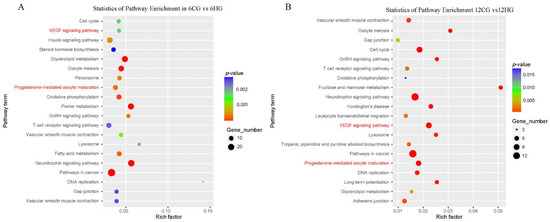 We preliminarily predicted the potential target genes of oni-miR-33 using TargetScan 7.2 and miRanda v3.3a, and then conducted Kyoto Encyclopedia of Genes and Genomes (KEGG) analyses to explore their potential functions. In the 6CG vs. 6HG comparison (Figure 5A), the potential target genes of oni-miR-33 were involved in multiple cell fate control, oocyte development and maturation, metabolism, and hormone regulation. In the 12CG vs. 12HG comparison (Figure 5B), the potential target genes of oni-miR-33 were involved in cell fate control, oocyte development and maturation, metabolism, and hormone regulation. The enrichment of several signaling pathways with targets of oni-miR-33 was detected at both 6 d and 12 d. The VEGF signaling pathway, which is involved the control of cell fate, was selected for further analysis.