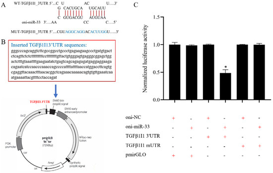 The bioinformatics analysis revealed that oni-miR-33 directly targets the 3′-UTR of the TGFβ1I1 gene in Nile tilapia (Figure 6A). The minimum free energy of oni-miR-33 and the target gene TGFβ1I1 was −21.0 kcal/mol. We cloned the Nile tilapia TGFβ1I1 3′-UTR into a luciferase reporter plasmid (Figure 6B), and then oni-miR-33 and pmirGLO, pmirGLO-TGFβ1I1 3′-UTR, or pmirGLO-TGFβ1I1 mUTR were co-transfected into HEK293T cells. Compared with the other treatment groups, the cells co-transfected with oni-miR-33 and mirGLO-TGFβ1I1 3′-UTR showed a significantly lower luciferase activity (p = 0.03 < 0.05; Figure 6C), confirming that miR-33 specifically targets the 3′-UTR of the TGFβ1I1 gene in Nile tilapia.