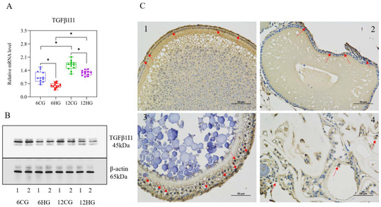 TGFβ1I1 transcript and TGFβ1I1 protein levels, and distribution of TGFβ1I1 protein of Nile tilapia (Oreochromis niloticus) ovary under heat stress. Note: (A) n = 12. * indicates statistical significance between heat-stressed group and control group (p < 0.05). (B) Representative images of Western blot from female fish in 6CG, 6HG, 12CG, and 12HG. (C) 1–4: Red arrow indicates positive expression of TGFβ1I1 protein (scale bar: 50 μm). Red arrows indicate positive signal of TGFβ1I1 protein. A and C correspond to control group (CG) on days 6 and 12, respectively; B and D correspond to heat-stressed group (HG) on days 6 and 12, respectively.
