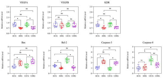 The results of qRT-PCR (Figure 7A) and Western blotting (Figure 7B) analyses showed that the TGFβ1I1 transcript and TGFβ1I1 protein levels in the ovary of Nile tilapia were significantly lower in the heat-stressed group than in the control group at 6 d and 12 d. The TGFβ1I1 protein was detected in the granulosa cell layer of Nile tilapia follicles by immunohistochemical analysis (Figure 7C), and the positive signal in the granulosa cell layer of the control group at 12 d was significantly stronger than that of 6 d (Figure 7C(1,3)). A weaker positive signal was detected in the granulosa cells detached from the degenerated follicle periphery at 12 d in the heat-stressed group (Figure 7C(4)). Next, we determined the transcript levels of key genes involved in the VEGF signaling pathway and apoptosis (Figure 8). The transcript levels of VEGFA (encoding vascular endothelial growth factor A) and KDR (encoding vascular endothelial growth factor receptor II) in the Nile tilapia ovary were significantly lower in the heat-stressed group than in the control group 6 d and 12 d (p = 0.04, 0.03 < 0.05); but the VEGFB levels had no significant difference between the heat-stressed group and the control group (p = 0.12 > 0.05). The Bax and Caspase-3 levels at 6 d and 12 d were significantly higher in the heat-stressed group than in the control group (p = 0.04, 0.04, 0.03, 0.04 < 0.05), while the transcript levels of Bcl-2 were significantly lower in the heat-stressed group than in the control group at 6 d and 12 d (p < 0.05). The transcript level of Caspase-8 was significantly lower in the heat-stressed group than in the control group at 12 d (p = 0.03 < 0.05), but not at 6 d (p = 0.14 > 0.05).