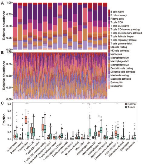 The composition of infiltrating lymphocytes in tumor and normal samples. (A) Stacked histogram showed the composition of 22 immune cells in normal samples. (B) Stacked histogram showed the composition of 22 immune cells in tumor samples. (C) Boxplot showed infiltration of 22 immune cells in normal and tumor samples. Dot means immune cell fraction in each sample. **** p < 0.0001, *** p < 0.001, ** p < 0.01, * p < 0.05.