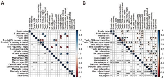 Correlation among immune cells in the tumor and normal samples. (A) Corrplot showed the correlation among 22 immune cells in normal samples. (B) Corrplot showed the correlation among 22 immune cells in tumor samples.