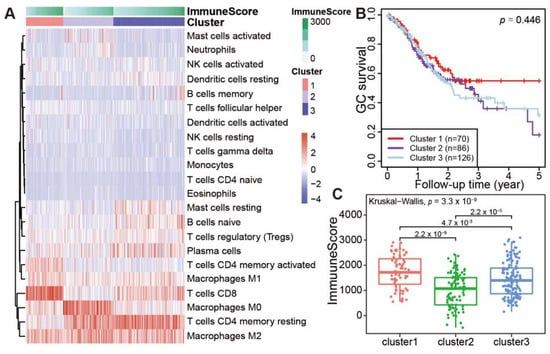 Immune clusters and its associated prognosis of stomach adenocarcinoma (STAD). (A) Heatmap showed the immune clusters of STAD. (B) Survival status in the three clusters. (C) Expression of the immune score in the three clusters.