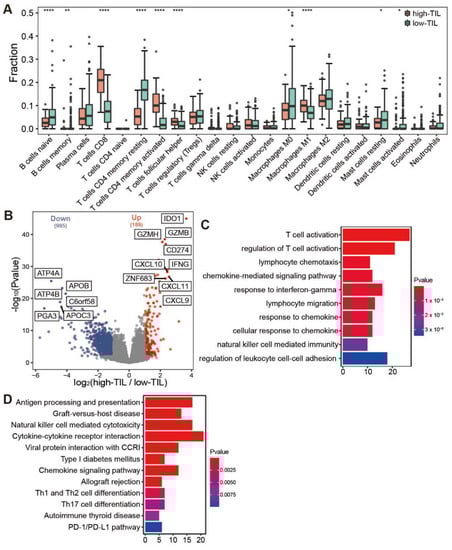 Comparative analysis of immune infiltration and differentially expressed genes between high-TIL and low-TIL subtypes. (A) Immune infiltration in high-TIL and low-TIL analyzed by CIBERSORT. (B) Differentially expressed genes between high-TIL and low-TIL subtypes. (C) Gene Ontology (GO) and (D) KEGG enrichment analysis of up-regulated genes in high-TIL subset. **** p < 0.0001, ** p < 0.01, * p < 0.05.