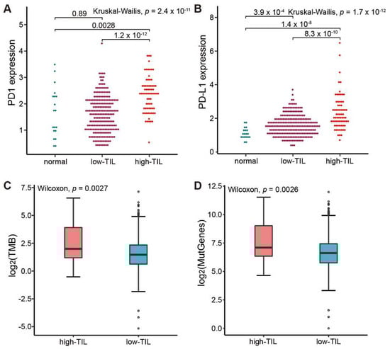 Of note, the expressions of both PD-1 and its ligand PD-L1 were significantly higher in the high-TIL samples (Figure 5A,B), suggesting that the immune cells might be suppressed in tumors. Mutation analysis showed that the tumor mutational burden (TMB) and the counts of mutated genes in these patients with high tumor-infiltrating lymphocytes were also obviously higher than that observed in lower prognosis group (Figure 5C,D). As patients with more mutated genes easily trigger immune responses when treated with immune checkpoint inhibitors (ICIs) [36], our results suggested that the group with higher tumor-infiltrating lymphocytes might benefit from the treatment with immune checkpoint inhibitors (ICIs).
