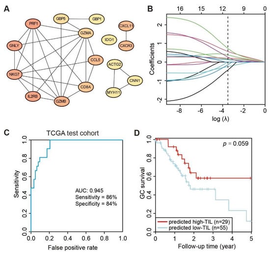 Development of predicting model relative to high-TIL subtype. (A) PPI network of 16 hub genes. (B) Least absolute shrinkage of the selected genes. (C) Receiver operating characteristic (ROC) curves of predictions based on 11 gene expression levels in the TCGA test cohort, n = 82. (D) Kaplan–Meier curve (log rank test) showing OS for the predicted high-TIL and low-TIL subtypes in the TCGA test cohort. (E) Receiver operating characteristic (ROC) curves of predictions based on 11 gene expression levels in ACRG validation cohort, n = 295. (F) Kaplan–Meier curve (log rank test) showing OS for the predicted high-TIL and low-TIL in the ACRG validation cohort.