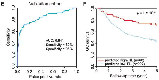 Lastly, the performance of the Prediction-Score in predicting subtypes of GC patients was evaluated. Based on the Prediction-Scores from training dataset, samples with a Prediction-Score greater than 0.276 were regarded as a high-TIL subtype. According to the same analysis and standard, the model achieved significant sensitivity and accuracy on the TCGA test dataset comprising 84 STAD patients and the AUC value reached 0.945 (Figure 6C). We further tested the model on the ACRG dataset, and the AUC values still reached 0.814 even with genetic heterogeneity existing between the two cohorts (Figure 6E). Based on the predicted subtypes on both TCGA test dataset and ACRG dataset, patients with higher Prediction-Scores (predicted high-TIL subtype) exhibited significant survival advantage than patients with lower Prediction-Scores (predicted low-TIL subtype) (Figure 6D,F). However, the result is statistically significant with 94.1% confidence due to the smaller sample size in the test set, which is less than the typical 95% confidence. These results demonstrated that the predictive model effectively stratified GC patients based on the personalized genomic data.