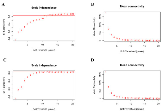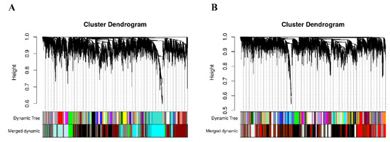 Weighted correlation network analysis (WGCNA) is a system biology method used to describe gene association patterns between different samples. It can identify gene sets (modules) with similar expression patterns, analyze the relationship between modules and sample phenotypes, draw the regulatory networks between genes in the modules and identify key regulatory genes [19,20]. The WGCNA algorithm first assumes that the gene network obeys a scale free distribution, and defines the gene co–expression correlation matrix and the adjacency function formed by the gene network, then calculates the dissimilarity coefficients of different nodes and constructs a hierarchical clustering tree accordingly [21]. The different branches of the clustering tree represent different modules; the module genes have a high degree of co–expression, while the genes belonging to different modules have a low degree of co–expression [22]. Through exploring the relationship between modules and specific phenotypes, the identification of gene networks can finally be achieved [23].
