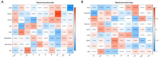 The correlation coefficient and correlation significance between the module and different time points of HS in IR64 (A) and Koshihikari (B). Each row in the table corresponds to a consensus module, and each column to a time point. The module name is shown on the y-axis, and the time point is shown on the x-axis. The table is color coded by correlation according to the color legend. Intensity and direction of correlations are indicated on the right side of the heatmap (red, positively correlated; blue, negatively correlated).