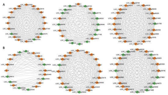 In order to more effectively search for the hub genes’ response to HS, we performed an interaction network analysis of IR64 and Koshihikari key genes with known-core genes, respectively. According to the K-means clustering algorithm, the interaction network was divided into three main modes, and the top 20 genes of each mode were taken as candidate hub genes (Table S6). As shown Figure 4A,B, IR64 and Koshihikari obtained 60 candidate–hub genes, respectively, in response to HS. In the candidate–hub genes, for IR64, 16 genes had been cloned (CHR745, hsp82B, OsBip1, OsBip2, OsBiP3, OsBiP4, OsDjA7, OsGrp94, OsGSK1, OsHSP1, OsHSP58.7, OsSTN8, OsTT1, OsUBC32, OsUBP6 and PP2A–A), with 19 putative ribosomal proteins and five putative Dnak family proteins included. For Koshihikari, 18 genes were cloned (HSP70, hsp82B, OsALDH5F1, OsALDH7, OsAmy3D, OsBADH1, OsBip1, OsBip2, OsBip3, OsDjA7, OsDPE2, OsGrp94, OsHSP1, OsHSP58.7, OsPho1, OsSSlllb, qGC-6 and RAmy1A), along with 20 putative ribosomal proteins and two putative Dnak family proteins. Among the candidate–hub genes of IR64 and Koshihikari, 28 genes were identical, which implies that there was a consistent HS response among the genotypes. Overall, two genotypes of rice were found to share some of the same hub nodes for the response to HS; however, different specific regulation responses were also involved.