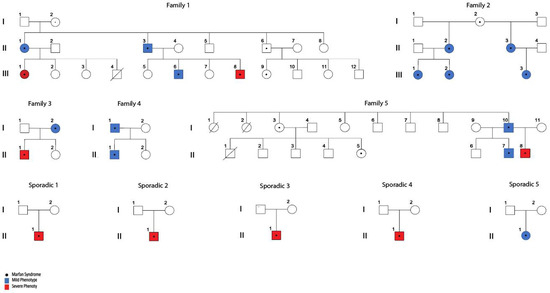 - Li, Y.; Xu, J.; Chen, M.; Du, B.; Li, Q.; Xing, Q.; Zhang, Y. A FBN1 mutation association with different phenotypes of Marfan syndrome in a Chinese family. Clin. Chim. Acta 2016, 460, 102–106. [Google Scholar] [CrossRef] [PubMed]