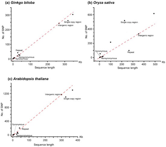 Scatter plot of length and number of SNPs for different categories within mitogenome. (a) Ginkgo biloba, (b) Oryza sativa, (c) Arabidopsis thaliana. The red dotted line indicates the relationship between length and the number of SNPs in intergenic region. Nonsynonymous and synonymous indicates nonsynonymous sites and synonymous sites of the coding regions of protein-coding genes, respectively.