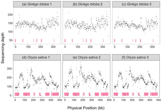 Sequencing depth of mitogenome. (a) Ginkgo biloba individual 1, (b) G. biloba individual 2, (c) G. biloba individual 3, (d) Oryza sativa individual 1, (e) O. sativa individual 2, (f) O. sativa individual 3. Pink color indicates the repeat sequences in mitogenomes.