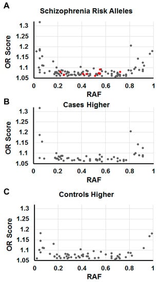 Distribution of OR scores as a function of RAF for the PGC risk alleles. (A) Data from 114 risk alleles are plotted. The red circles represent SNPs associated with functional syntenic blocks as described in the text. (B) Plots of 57 SNPs that occurred more frequently in cases of schizophrenia than controls, and (C) 57 SNPs that were higher in controls than cases. It is worth noting that the case and control distributions are superficially very similar to each other.