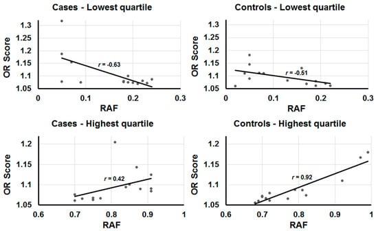 Regression analyses comparing RAF with OR score. Data from the highest and lowest quartiles were evaluated by standard regression analysis for relationships between their allele frequencies and adjusted OR scores. The plots show the lowest and highest quartiles of data points from SNPs that occur more frequently in cases than controls and vice versa (as labeled). The trend lines are included along with the correlation coefficient, r.