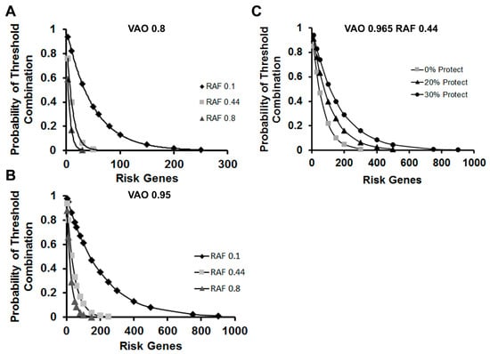 Risk-gene estimation. Graphs were rendered for the number of risk genes required to reach the 0.01 probability of threshold risk-gene combination in the population (Pt) from pairs of alleles associated with risk polymorphisms. The VAOs are labeled as 0.8 (A) and 0.95 (B). The average RAFs used in Equation (2) are indicated in the inset legends. (C) Estimation of risk alleles needed to reach threshold with protective variants included either 20% or 30% of the total (as labeled). We assumed that the protective variants had a VAO of 1.035 with a resulting FLO of 1.015, which was equal in magnitude, but opposite in effect from the VAO of 0.965 (FLO = 0.985) for adverse risk variants.