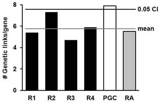 To determine the statistical significance for comparisons between the number of genetic interactions among genes in the different sets, we first calculated the mean and standard deviation from data derived from 4 random lists of genes expressed as the number of links per gene obtained from GeneMANIA, as previously published [,]. Based on the standard deviations from the random gene lists, we established confidence intervals (CIs) for significant differences at the p < 0.01 or p < 0.05 levels. We then determined whether the data from the PGC dataset surpassed the CIs calculated from the four random gene sets.