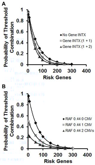 Estimation of risk-gene threshold with inclusion of gene–gene interactions and CNVs. (A) Data are plotted for the number of risk genes required to reach the 0.01 probability of threshold combination when gene–gene interactions are included in the calculation. For this model, the VAO is 0.965 and the FLO 0.985 with RAF is set at 0.44. Of the total risk genes, 30% are modeled as interacting with 1 (1 + 1) or 2 (1 + 2) other genes, which require substitution of either 0.97 (0.9852) or 0.956 (0.9853) into Equation (2) for genes with 1 or 2 partners, respectively. For comparison, calculations with no gene interactions (INTX) are also shown. (B) With the same settings as (A), the model includes 0, 1 or 2 CNVs, which are represented with FLOs of 0.5.