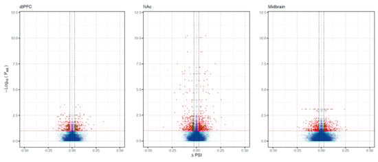 To investigate differential spliced genes between individuals with a substance use disorder and controls, we used Leafcutter (v 0.2.9; Yang Li, Stanford, CA, USA)–a powerful method that circumvents methodological limitations of previous approaches (e.g., relative isoform or exon usage) [29]. A differentially spliced gene encompasses multiple clusters of individual alternative mRNA splicing events characterized by the Vertebrate Alternative Splicing and Transcription Database (https://vastdb.crg.eu/wiki/Main_Page; accessed on 22 November 2021). Splicing events were categorized into four general categories: (1) exon skipping, (2) intron retention, (3) alternative acceptor donor splice sites, or (4) alternative donor splice sites. Differential splicing was quantified using a Dirichlet-multinomial generalized linear regression and used default Leafcutter filtering parameters (removing clusters: with <5 samples per intron and clusters with <20 reads per group; 9238–11,821 genes post-filtering). The effect size for differential splicing is a percent change spliced in (ΔPSI), which estimates the alternative exon usage between cases and controls. In our analyses, a positive ΔPSI would indicate that an individual with OUD would be more likely to possess a certain protein-coding region in a gene than a control. A differentially spliced gene was required to survive a Benjamini–Hochberg false discovery rate correction (FDR < 0.10) and surpass an effect size-based cut-off (|ΔPSI| > 0.025).