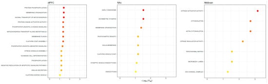 Functions of alternative splicing associations with OUD across brain regions. Possible functions of differentially spliced genes associated with OUD. The X-axis denotes the level of significance and the y-axis shows the different gene ontology terms (KEGG pathways, biological processes, molecular functions, and cellular components). Note no significant (FDR < 0.1) gene ontology terms were linked across all brain regions, highlighting regional specificity.