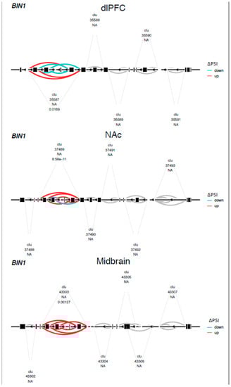Differential splicing of the BIN1 gene in the CLAP domain across brain regions. Leafviz plot of BIN1 gene showing a complex splicing event associated with OUD across brain regions. Red indicates increased and blue represents decreased intron usage in individuals with OUD relative to the controls. For a list of specific differential splicing events and their functional characterizations, see Supplementary File S1. Clu = cluster. The number directly below it is an arbitrary cluster number. The number below NA is the FDR-adjusted p-value for a cluster.