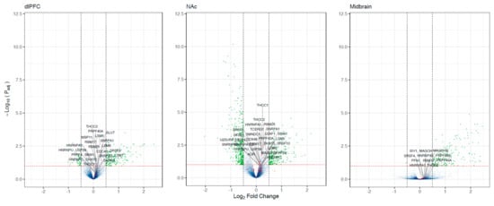 Next, we performed differential expression analyses. Our results were consistent with previous analyses of these data. Log2 fold change estimates were strongly correlated with previously reported differentially expressed genes with these data (r = 0.60–0.98, all p < 2 × 10−16). In total, we observed 922 differentially expressed transcripts (see Supplementary File S3); of these, only 3.2% were also differentially spliced. No spliceosome gene was differentially expressed between individuals with OUD and the controls (see Figure 4). However, when performing a ranked-based enrichment test, we found that spliceosome genes were significantly upregulated in OUD in the dlPFC, NAc, and the midbrain (all normalized enrichment score = 1.30–2.32, all log2error = 0.21–0.78, all p = 0.056–2.839 × 10−9). The expressions of spliceosome genes were consistent across brain regions and samples (see Figure 5). Eighteen leading-edge genes consistently drove the enrichment of the spliceosome across and demonstrated consistent patterns across individuals (see Supplementary Figure S4).