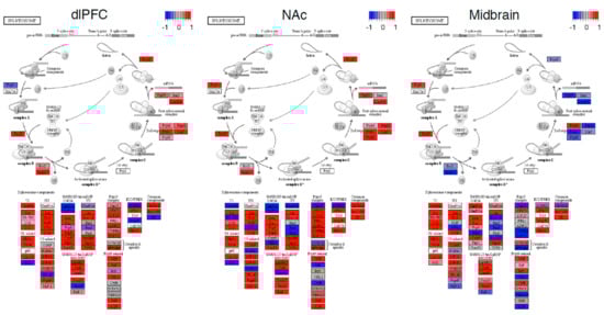 Spliceosome pathway in OUD neurocircuitry. KEGG pathview plots of the spliceosome pathway organized into specific components and stages of the spliceosome. Red denotes an increased expression and blue denotes a decreased expression for a gene in OUD. The −1 to +1 scale for these plots uses a differential expression (Wald) statistic.