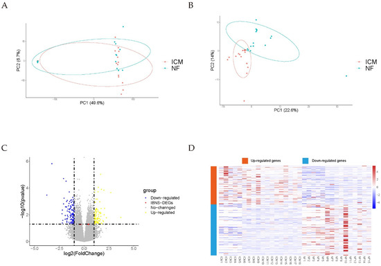 Two RNA-seq datasets (GSE120852 [28], GSE55296 [29]), including 18 ICM and 15 NF samples, were combined with batch effects eliminated. In total, 208 differentially expressed genes (DEGs), including 118 downregulated and 90 upregulated genes, were identified in a meta-analysis using the strict cutoff (p value < 0.05, |(log2FC)| ≥ 1) (Table S4). Next, the batch effects were eliminated, the distributions of sample row counts before adjustment for batch effects and the distributions of DEGs after adjustment are illustrated in the PCA plots (Figure 2A,B). A volcano plot and DEGs heatmaps are shown in Figure 2C,D. The top 50 DEGs ordered by p value are presented in Table 1. Due to the variation in the human samples, we also used the loose cutoff (p value < 0.05, |(log2FC)| ≥ 0.7) to screen DEGs, including 201 upregulated and 255 downregulated genes (Table S5).
