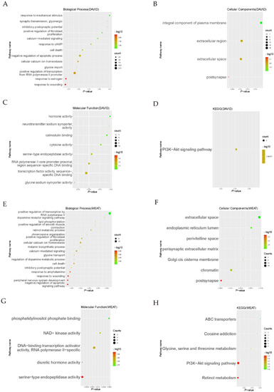 The DAVID GO and KEGG analysis for pathway enrichment analyses totally depend on the category count numbers of the gene list and one gene set, ignoring the different importance of every single gene. The weighted enrichment analysis (WEAT) method can overcome the issue of treating every gene equally to the conventional method [25]. The results of WEAT GO and KEGG analyses of the upregulated genes screened by the strict cutoff are shown in Figure S2. In the WEAT GO analyses of downregulated genes screened by the strict cutoff, the most enriched biological process (BP) terms were associated with negative regulation of the apoptotic signaling pathway, peripheral nervous system development, and response to wounding. The most enriched terms for cellular components (CC) were mainly associated with post synapse and chromatin. The most enriched molecular function (MF) terms were associated with serine-type endopeptidase activity, diuretic hormone activity and DNA-binding transcription activator activity, RNA polymerase II-specific. (Figure 3E–G). In the WEAT KEGG analysis, the downregulated genes screened by the strict cutoff were enriched in Retinol metabolism, ABC transporters, and PI3K-Akt signaling pathway (Figure 3H).