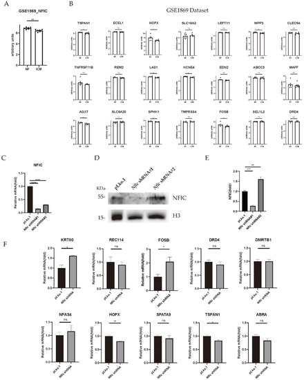 Verification of predicted genes with NFIC-binding motif. (A) The expression of NFIC in the validating GSE1869 dataset. (B) Expression of predicted genes with an NFIC-binding motif in the validating GSE1869 dataset. (C) The mRNA expression level of Nfic in H9C2 cells. (D) Western blot analysis of NFIC in H9C2 cells. (E) Quantification of the expression of NFIC in H9C2 cells. (F) The mRNA expression level of predicted genes in Nfic knockdown H9C2 cells (n = 3 per group). * p value < 0.05; ** p value < 0.01; *** p value < 0.001; **** p value < 0.0001; NF, normal heart tissue; ICM, heart tissue of ischemic cardiomyopathy patient; ns: no significance.