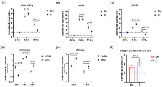Normalized expression levels of MSH2 in whole kidney (a), cortex (b) and medulla (c) along with the direct comparison of expression levels between medulla and cortex in control (d) and diabetic groups (e). The last chart (f) represents a comparison of MHS2 expression in diabetic and healthy rats (C) regardless of age and tissue compartment. In each chart, expression was normalized to the level of a 2-month-old group, data are shown as the mean and standard error of mean. Rats in diabetes mellitus group (DM) were diabetic for 6 months in the case of the 8-month-old group and 12 months in the case of the 14-month-old group. All p-values presented in the figure were calculated by a t-test.