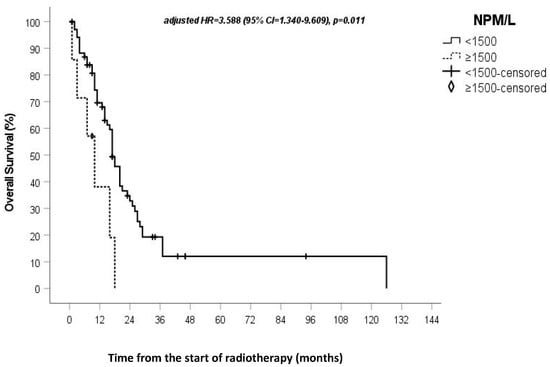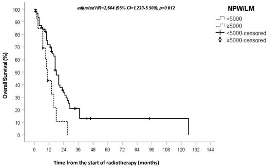 In the univariate Cox regression analysis, all indexes except NPW/(L + M) and PW/L showed a statistically significant impact on OS rate (Table 2). In the multivariate Cox regression analysis, NPM/L and NPW/LM maintained their statistically significant impact. The median OS rate in patients with NPM/L ≥1500 was 10 months (95% CI = 3.8–16.2 months), whereas in patients with NPM/L <1500, it was 17 months, p = 0.014, HR 2.98 (95% CI = 1.243–7.161). The median OS rate in patients with NPW/LM ≥5000 was 11 months, whereas it was 18 months in patients with NPW/LM <5000 (95% CI = 15.5–20), p = 0.012, Hazard ratio (HR) 2.411 (95% CI = 1.218–4.771). The data from the multivariate analysis of the two indices remained statistically significant even when assessing the impact of the type of surgery on patient survival. Figure 1 and Figure 2 report the overall survival rate based on NPW/LM and NPM/L value stratification, respectively.